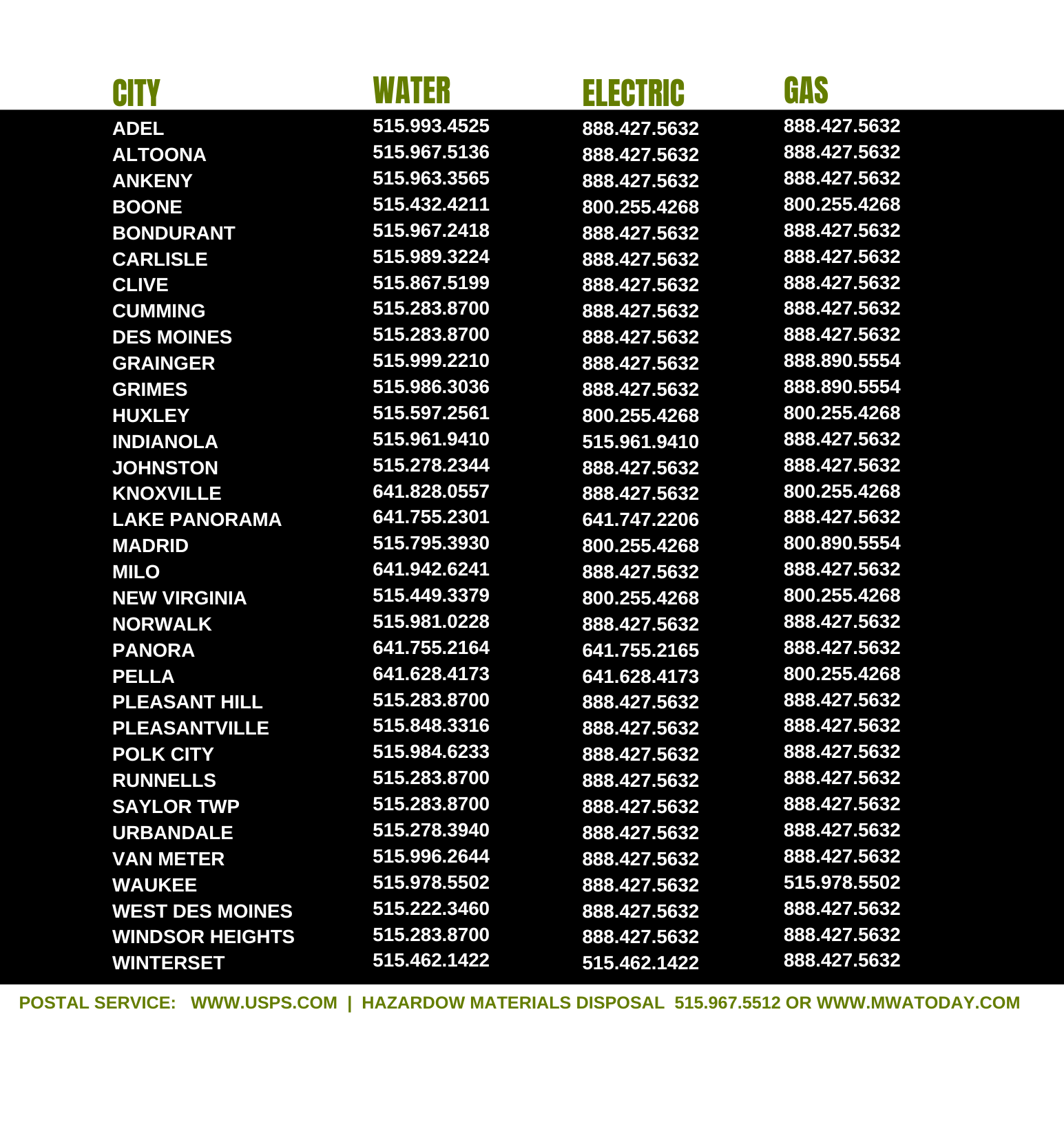 Setting up your utilities is a key step in the moving process.  Attached are all key phone numbers by city.